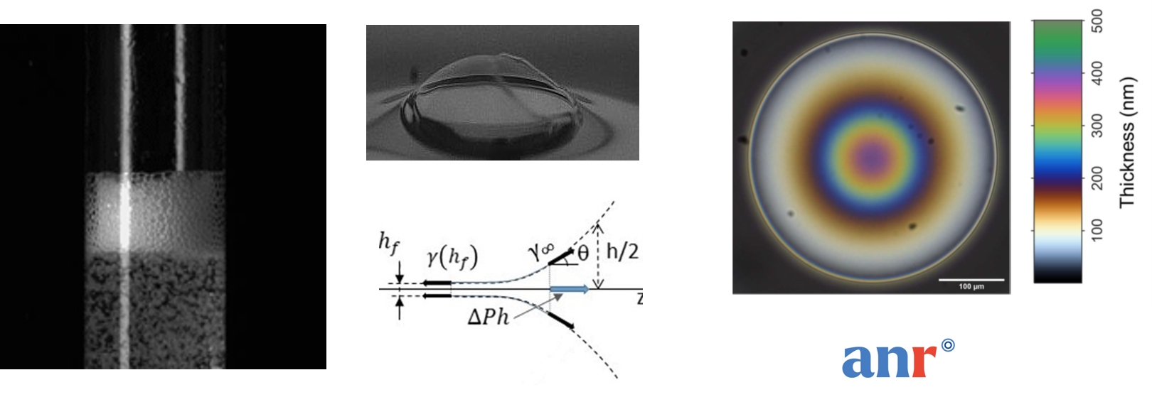 (A) Foaming of a liquid mixture in a column by air injection from the bottom. The foam height is directly set by the coalescence time of the bubbles. (B) Bubble bursting at the surface of an oil binary mixture. (C) Observation of a thin liquid film using white-light interferometry, allowing for the reconstruction of the thickness profiles over time. Bursting is observed when the thickness decreases down to 50 nm.