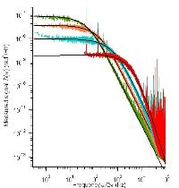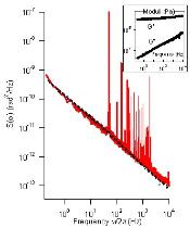 On peut ainsi mesurer les ondes capillaires induites par l’agitation thermique à la surface libres de fluides visqueux (figures de gauche), mais également les ondes élastiques se propageant à la surface libre d’un solide viscoélastique (du caoutchouc, figure de droite), et ce dans une très large gamme de fréquences. Nous avons relié les densités spectrales de puissance de bruit mesurées aux propriétés des milieux dont nous avons étudié la surface libre. Dans le cas des fluides visqueux, le signal mesuré dépend de la viscosité du fluide, de sa masse volumique et de sa tension de surface. Dans le cas de milieux viscoélastiques, et lorsque la tension de surface et la masse volumique sont connues, les variations avec la fréquence du module élastique et du module de perte peuvent être déduites du spectre des fluctuations. Nous avons ainsi mesuré les propriétés de viscoélasticité linéaire de solides mous (des PDSM réticulés) et de fluides complexes (des solutions de polymère supramoléculaires) dans une large gamme de fréquences (d’environ 0,1Hz à 10kHz).