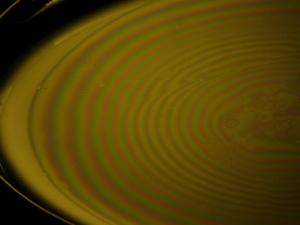 Film d’huile silicone étalé sur un substrat liquide. La présence de franges reflète l’épaisseur non uniforme du film.