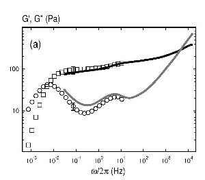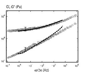 Modules élastique et de perte d’un solide mou (un PDMS reticule, ci-dessus), et d’un fluide complexe (une solution de polymères supramoléculaires, ci-dessous) mesurés par SFSR (traits pleins et tirets) et comparés à des mesures de rhéométrie (symboles).